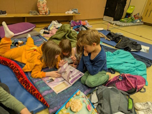 Endlich war Schlafenszeit. Zuerst hat uns Herr Costa ein Buch vorgelesen. Das Buch hieß „Phillip und Anne unterwegs zum Mond“. Es war spannend. Dann durften wir unsere Bücher lesen. Frau Köster hat uns dazu schöne Musik angemacht. Darauf mussten wir schlafen. Um 06:15 Uhr haben meine Freunde mich geweckt. Manche Kinder haben noch geschlafen. Wir durften schonmal zum Spieleraum gehen. Ich habe einen großen Turm gebaut. Dann sollten wir unsere Sachen einpacken. Später sind wir zur Brotzeit gegangen und wurden dann von den Eltern abgeholt. Es war sehr, sehr toll! Ich warte schon auf das nächste Abenteuer.