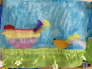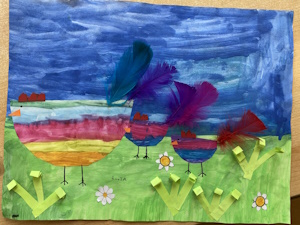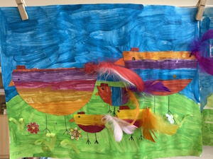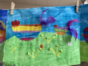 Die Kinder der Klasse 1a haben letzte Woche im Kunstunterricht wunderschöne, farbenfrohe Osterbilder gemalt und mit bunten Federn verziert.