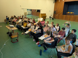 An der Schule zurück haben wir die Betten aufgebaut. Oh man, ah es gab sogar eine richtige Kissenschlacht! Natürlich habe ich mir das nicht entgehen lassen. Puh! Darauf erst einmal eine Pizza essen und einen Film anschauen. Das war so cool! Später sind wir schlafen gegangen! Schnarch! Schnarch! Am nächsten Morgen bin ich erstmal nach oben in den Spieleraum gegangen. Dann gab es Frühstück. Das war richtig toll! Wir sehen uns bald wieder!