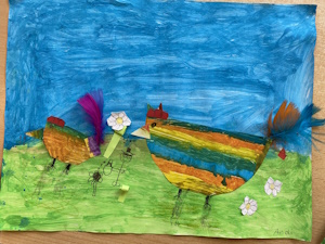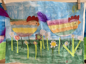 Die Kinder der Klasse 1a haben letzte Woche im Kunstunterricht wunderschöne, farbenfrohe Osterbilder gemalt und mit bunten Federn verziert.